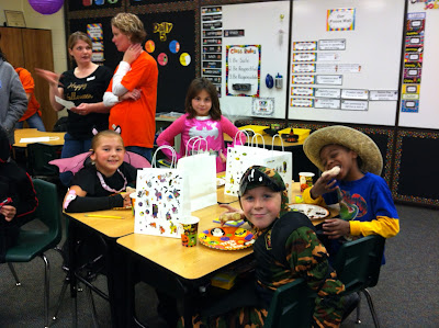 The Halloween party was a hoot! Here are some cute pictures of our little ones in costumes and the party festivities! We decorated treat bags, passed out party treats, ate cinnamon sugar donuts and drank cider, paraded through the building and played pass the pumpkin! It was hard to get a clear photo with everyone moving about! :)